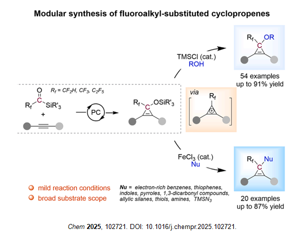 武漢大學沈曉團隊提出了一種模塊化合成氟烷基取代環丙烯的方法,以氟烷基酰硅烷作為卡拜陽離子等價物,實現了高效合成。反應核心是光催化硅氧基卡賓與炔烴的 [2+1] 環加成,再經酸催化 C-O 鍵官能化,硅氧基的優良離去基團特性推動了反應進行。該方法具有廣泛的底物范圍,能兼容末端、內部、芳香族和脂肪族炔烴,以及醇、富電子苯、噻吩、吲哚等多種親核試劑,生成醚、芳烴、硫醚等各類環丙烯衍生物。實驗涵蓋 54 個氟烷基取代環丙烯實例,產率最高達 91%;20 個后續官能化實例,產率最高 87%。此外,該方法可用于復雜分子的后期官能化,成功實現克級合成,且產物能進行擴環、芳基化等下游轉化。這一成果解決了二氟甲基環丙烯合成缺乏通用方法的問題,為藥物設計等領域提供了兼具環丙烯張力和氟烷基生物電子等排特性的新型骨架。