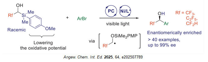 武漢大學沈曉團隊首次實現了光催化自由基布魯克重排與對映選擇性交叉偶聯的結合,為手性 α- 氟烷基醇的對映收斂合成提供了創新策略。這類含氟醇是多種藥物的關鍵骨架,但傳統合成方法存在對映選擇性低或官能團兼容性差的問題,該研究有效突破了這一局限。 該方法展現出突出優勢:涵蓋 40 余種底物,對映選擇性高達 99% ee;能兼容酯基、氰基、鹵素等多種官能團,尤其耐受傳統方法敏感的羰基結構;可實現復雜生物活性分子的后期官能化,如薄荷醇、磺胺二甲氧嘧啶衍生物的氟烷基化修飾。此外,通過選用對映異構配體,可靈活合成目標產物的兩種對映體,實用性極強。